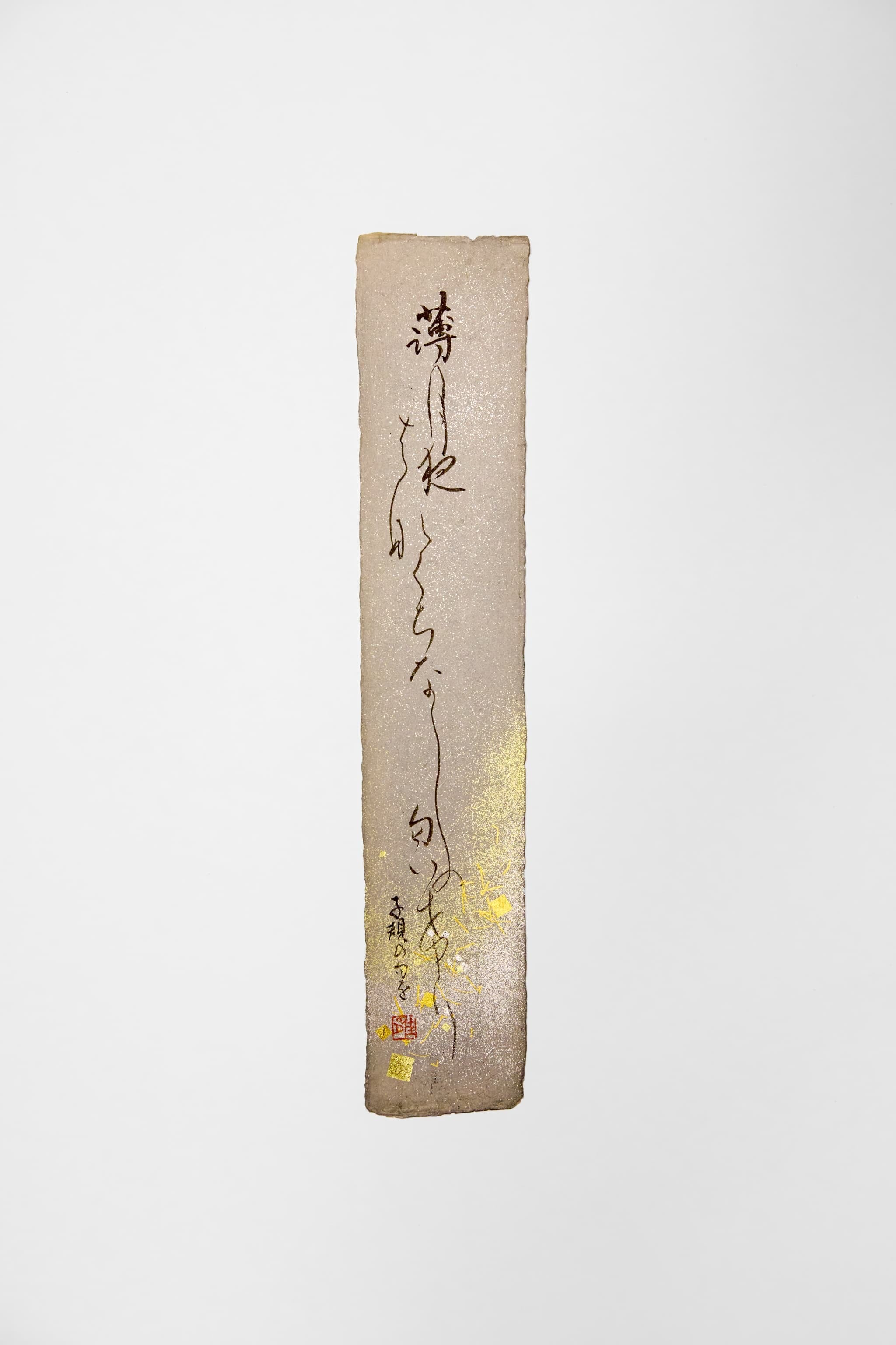 繊維のゆらぎが情緒のある料紙に、砂子や切箔、野毛を施した作品。野毛は箔を細かく切るための高い技術が必要。繊細な野毛を作る佳邑の高い技術は、国内でも稀に見る完成度です。