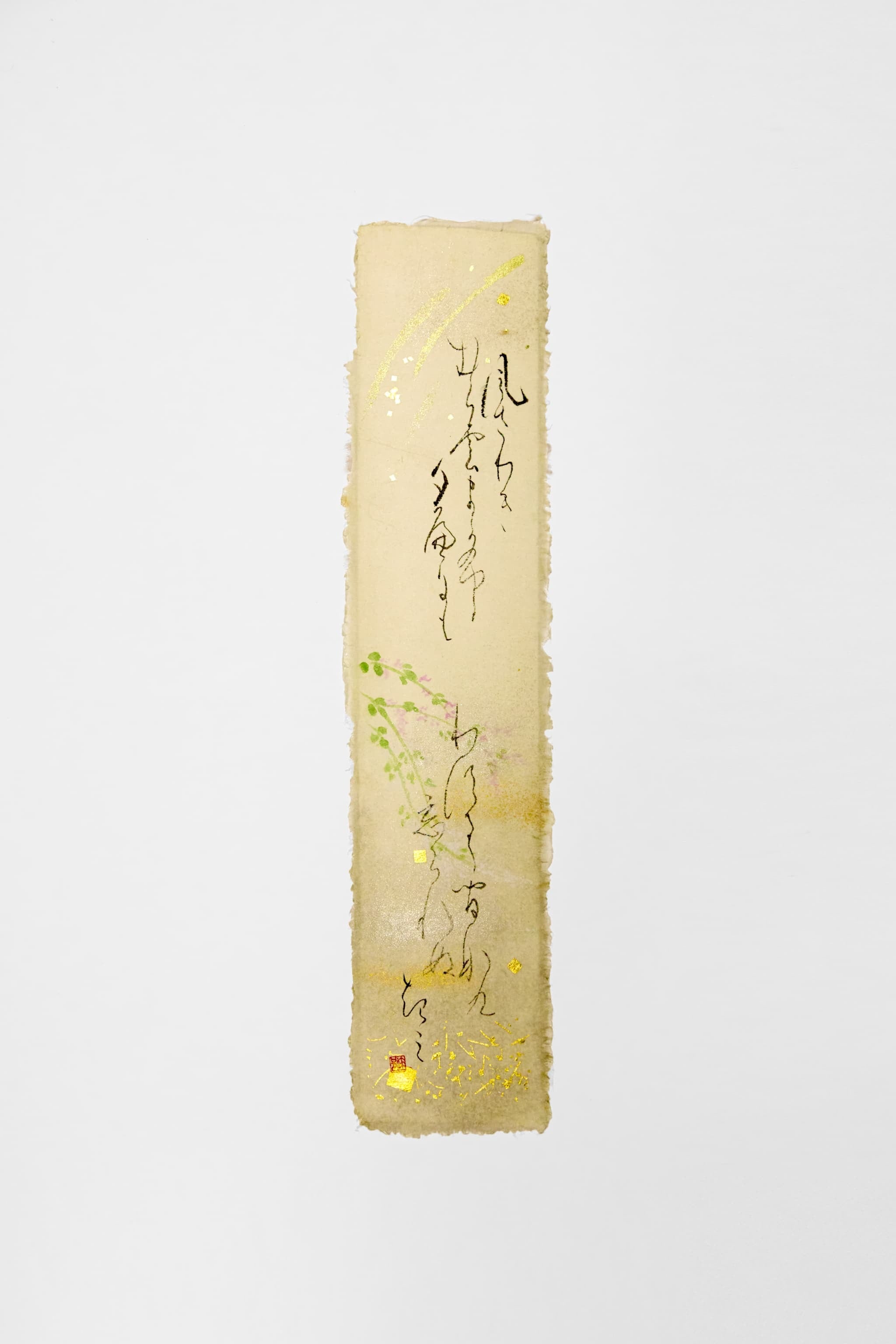 繊維のゆらぎが情緒のある料紙に、自然を描き、金の砂子や野毛を施した作品。